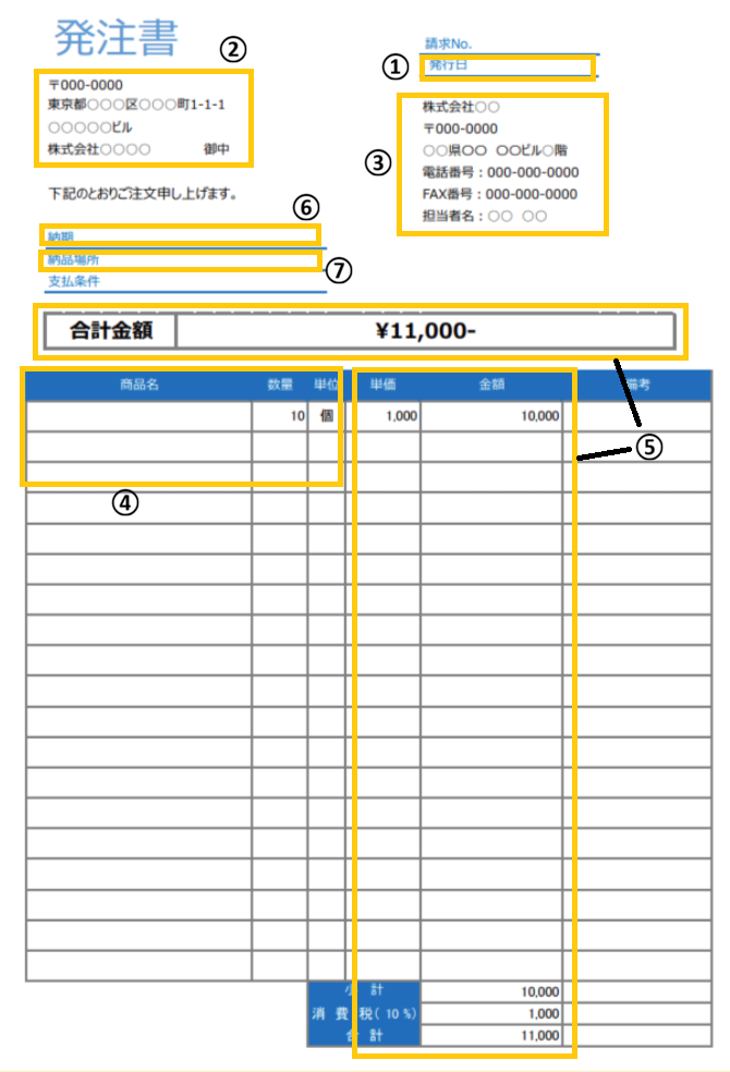 注文書の金額がそのまま請求金額になるわけではありませんが、後に請求される予定の金額を記載しておけば、金額について双方の認識をそろえられます。税込みか税抜きかについても記載することで、紛らわしさの回避が可能です。