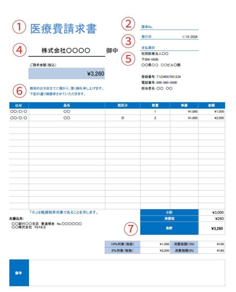 冒頭には、請求書であることが一目で分かるタイトルを記載します。「医療費請求書」や「健診費請求書」など、請求内容に即した名称を用いると、より明確です。