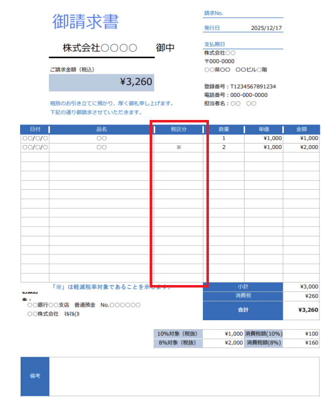 なお、税区分・税率以外の項目は通常の請求書と同様に作成して問題ありません。