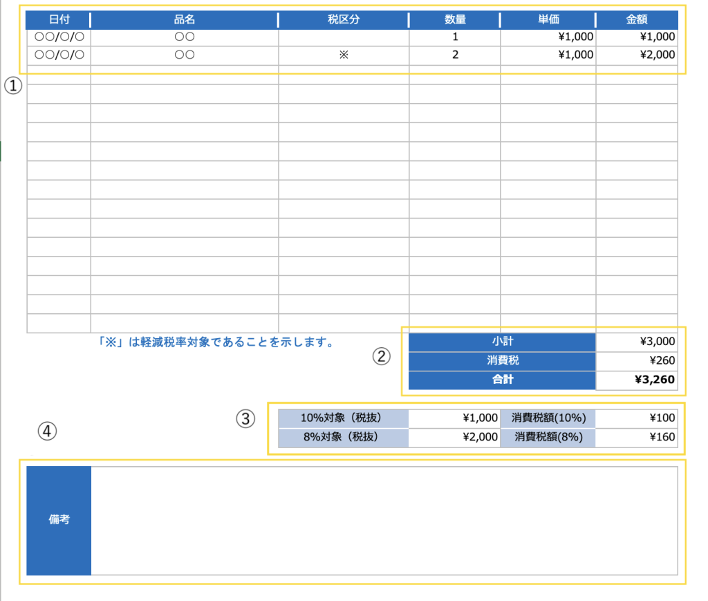 今回は、「金額」「¥2,000」の行の「税区分」にのみ「※」を記載しています(軽減税率表示対象)。つまり、「¥1,000」が消費税10%対象、「¥2,000」が消費税8%の対象です。